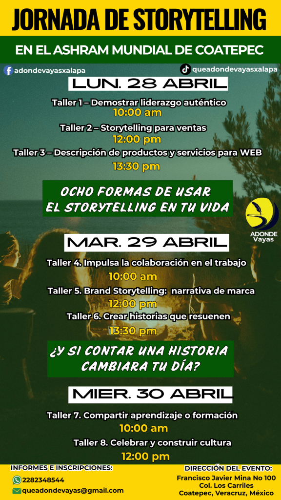 Coatepec, Ver., 21 de abril de 2025.- Bajo el lema “8 formas de usar el storytelling en tu vida”, el Ashram Mundial de Coatepec será sede de la primera Jornada de Storytelling, una experiencia de tres días dedicada al arte de contar historias con intención y emoción.